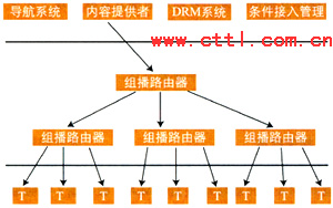 IPTV業(yè)務(wù)提供者可以根據(jù)用戶的請(qǐng)求,利用IP網(wǎng)絡(luò)本身所提供的組播能力將視頻信息以組播的方式傳送給用戶。此時(shí),同時(shí)向相同的業(yè)務(wù)提供者請(qǐng)求發(fā)送相同內(nèi)容信息的用戶,可以由業(yè)務(wù)提供者安排在同一個(gè)組播組中接收到相同的信息。為給內(nèi)容提供者提供知識(shí)產(chǎn)權(quán)保護(hù),業(yè)務(wù)提供者提供條件接入控制。同時(shí)為減少骨干網(wǎng)絡(luò)傳輸?shù)膲毫Γ瑯I(yè)務(wù)提供者在向眾多的用戶提供組播式業(yè)務(wù)時(shí)可以利用多級(jí)組播的形式來實(shí)現(xiàn)。組播式IPTV業(yè)務(wù)可能的系統(tǒng)模型示意如圖1所示。