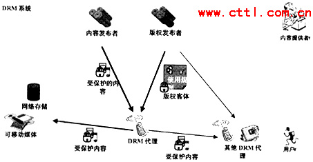 如圖4所示,DRM系統(tǒng)主要負責(zé)將內(nèi)容發(fā)布者發(fā)布的信息與版權(quán)發(fā)布者發(fā)布的信息組合起來將內(nèi)容變?yōu)槭鼙Wo的內(nèi)容,由版權(quán)客體提供使用規(guī)則,用戶在使用內(nèi)容時需要首先從DRM代理處根據(jù)使用規(guī)則獲得使用受保護內(nèi)容的密鑰,然后使用所獲得的密鑰對受保護的內(nèi)容進行解碼并使用。