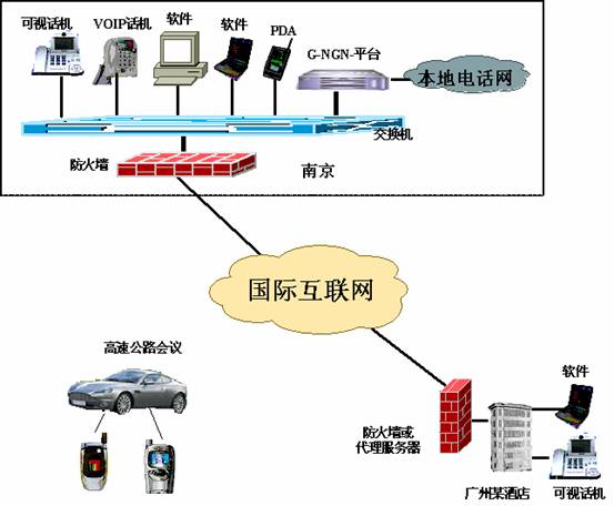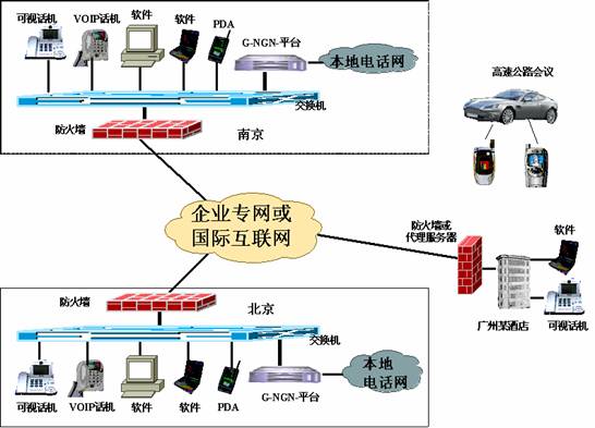 G-NGN-Softswitch產(chǎn)品可以使集團用戶通過租用網(wǎng)絡運營商的寬帶線路,或者直接借助國際互聯(lián)網(wǎng)組建成連接全市、全省乃至全國的集團內部網(wǎng)絡電話,可以提供可視話機、非可視話機、客戶端軟件、PDA等多種便捷方式實現(xiàn)集團內部的可視或非可視通訊。