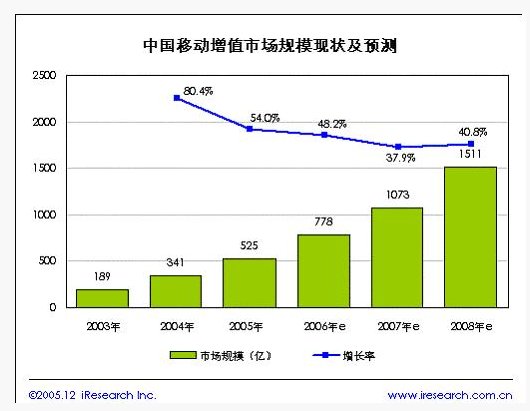 隨著中國移動電話用戶的不斷增長和移動增值服務的不斷發(fā)展創(chuàng)新,移動增值服務已經成為現(xiàn)隨著市場的發(fā)展和不斷規(guī)范,中國移動增值服務市場將進入相對平穩(wěn)的發(fā)展階段。據iResearch預測,中國移動增值服務的市場規(guī)模增長速度將逐年減緩,到2008年受奧運會影響增長速度提高,規(guī)模將突破1500億元。