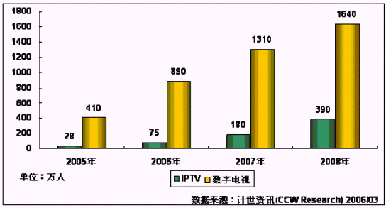 當(dāng)然,從國際上看,電信和廣電的融合是主流趨勢,但從目前國內(nèi)的情況來看,由于牽扯到利益沖突,融合并非一句話的事,仍需要克服重重阻力。計(jì)世資訊(CCW Research)的數(shù)據(jù)顯示,在2005年IPTV的用戶只有僅僅28萬人,而廣電數(shù)字電視用戶已經(jīng)達(dá)到410萬人。相信在未來幾年內(nèi)這個(gè)比例很難有大的變動。IPTV要想趕超數(shù)字電視還需要付出更大的努力。