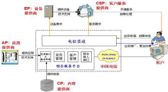 中國(guó)電信:綜合信息服務(wù)提供商,提供品牌、平臺(tái)、接入和渠道,負(fù)責(zé)業(yè)務(wù)的組織、運(yùn)營(yíng)、銷售和管理,并為客戶提供統(tǒng)一的服務(wù)界面。