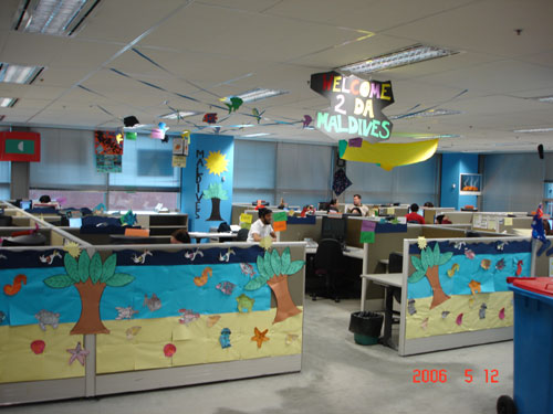 由于這種獨(dú)特的管理方式吸引了眾多的同行前來(lái)參觀(guān),該中心特別安排了熱情的Sally負(fù)責(zé)導(dǎo)游。Sally帶我們參觀(guān)說(shuō)的第一句話(huà)就是:“我真是喜愛(ài)我們的呼叫中心,這里的年輕人富有創(chuàng)意,充滿(mǎn)激情,他們非常喜歡在這里工作。”于是我們參觀(guān)了“蜘蛛俠”,“蒙娜麗莎”,“大英帝國(guó)”,“典雅餐廳”,“熱帶公園”,“幾何世界”,“海底世界”,“白色圣誕節(jié)”等不同的Pod,實(shí)在是好像到了聯(lián)合國(guó)。