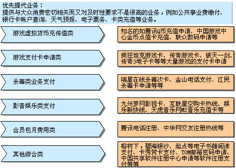 有了好的平臺與技術(shù),還必須設(shè)計好的業(yè)務(wù)。電信經(jīng)濟(jì)是一個從來就不缺少技術(shù)的經(jīng)濟(jì),關(guān)鍵如何設(shè)計出一個符合用戶體驗、滿足用戶需求、方便用戶使用的業(yè)務(wù)?諾盛基于對于電信標(biāo)準(zhǔn)運營流程的研究結(jié)合國外的先進(jìn)經(jīng)驗認(rèn)為:固話支付的業(yè)務(wù)大致可以分為兩類:一類是優(yōu)先發(fā)展的業(yè)務(wù);一類就是現(xiàn)金流業(yè)務(wù)