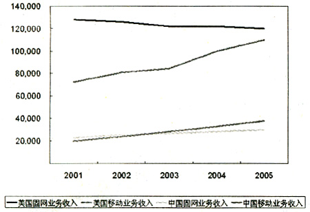 美國(guó)與中國(guó)固網(wǎng)與移動(dòng)業(yè)務(wù)收入比較(單位:百萬(wàn)美元)
