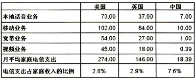 2005年美國(guó)、英國(guó)和中國(guó)電信消費(fèi)支出構(gòu)成比例分析(單位:美元)