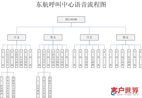 中國東方航空公司呼叫中心于2004年3月18日開始運營,特服電話號碼:95108。現(xiàn)有座席88席,員工185名。座席區(qū)總面積為532平方米。電信接入路由240路,IVR 150路。呼叫中心設有系統(tǒng)支持部﹑品質(zhì)監(jiān)控部﹑運營管理部和綜合業(yè)務部四個部門。通過近三年的運營及改善,東方呼叫中心已經(jīng)進入正軌,成為了東航服務窗口中極其重要的板塊。