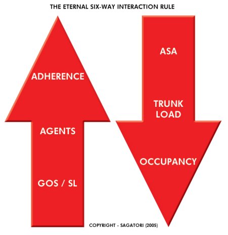 以Inbound坐席員為例,SAGATORI提出的KPI就只有兩個(gè):日程遵守度和質(zhì)量。這里邊首先包含了對(duì)呼叫中心運(yùn)行邏輯和動(dòng)力傳遞機(jī)制的透徹理解。SAGATORI把它總結(jié)為“呼叫中心永恒不變的6條法則”,以下是一個(gè)簡(jiǎn)單圖示(詳細(xì)解釋在此省略):