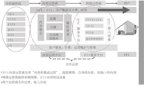 IPTV內(nèi)容集成運(yùn)營商,電信運(yùn)營商提供寬帶網(wǎng)絡(luò)及IPTV系統(tǒng),雙方合作提供業(yè)務(wù)的業(yè)務(wù)模式。這一模式一方面可以發(fā)揮廣電在內(nèi)容監(jiān)管、內(nèi)容運(yùn)營方面的優(yōu)勢,另一方面可以延續(xù)電信在互聯(lián)網(wǎng)運(yùn)營和維護(hù)上的優(yōu)勢。雙方之間的合作是資源與資源的對(duì)接,優(yōu)勢與優(yōu)勢的合作,各用所長,共同推進(jìn),利益共享。