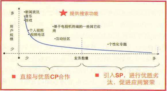 增值業(yè)務(wù)內(nèi)容定位可參考長(zhǎng)尾理論模型。長(zhǎng)尾理論的頭部通常是大眾市場(chǎng),要求產(chǎn)品滿足用戶符號(hào)化的需求,主流業(yè)務(wù)將具備更廣的流行效應(yīng),如新聞、游戲和音樂,頭部的業(yè)務(wù)往往能夠滿足大規(guī)模用戶需求,提供優(yōu)質(zhì)業(yè)務(wù)體驗(yàn);尾部通常是細(xì)分市場(chǎng)和互動(dòng)市場(chǎng),要求業(yè)務(wù)滿足生產(chǎn)與消費(fèi)一體化的需求,體現(xiàn)交互性,為用戶帶來整合的、一對(duì)一的體驗(yàn),以促進(jìn)IPTV應(yīng)用繁榮。