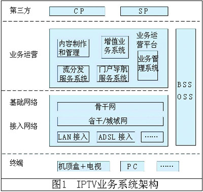 IPTV業(yè)務(wù)系統(tǒng)架構(gòu)可分為四層: 第三方業(yè)務(wù)提供者如CP和SP、業(yè)務(wù)運營層、網(wǎng)絡(luò)承載層和用戶終端層(如圖1)。
