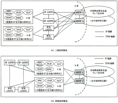 該種方案情況下,省內(nèi)支持IP信令的網(wǎng)元直接與IP LSTP相連(兩級(jí)組網(wǎng)情況下還需要通過TDM方式與現(xiàn)有HSTP相連),不支持IP信令的網(wǎng)元仍保持原有連接方式與現(xiàn)有LSTP相連(兩級(jí)組網(wǎng)情況下還要與HSTP)。省際信令消息仍由現(xiàn)有長途No.7信令網(wǎng)疏通,省內(nèi)信令由LSTP疏通。