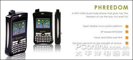 GUPP公司PHREEDOM手機(jī)基于VoWifi/GSM雙模的手機(jī)可以讓用戶自由選擇網(wǎng)絡(luò)。除了正常的GSM網(wǎng)絡(luò)之外,在有WiFi覆蓋的地方,用戶便可以使用WiFi網(wǎng)絡(luò)進(jìn)行通話,從而節(jié)約話費(fèi)。在WiFi環(huán)境中,它還也可以進(jìn)行網(wǎng)頁(yè)瀏覽、郵件收發(fā)、數(shù)據(jù)下載等操作。