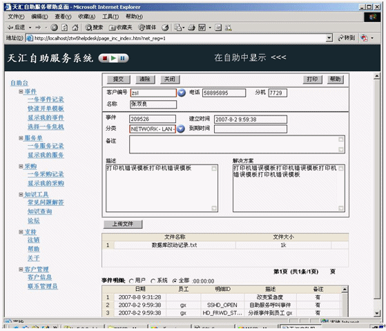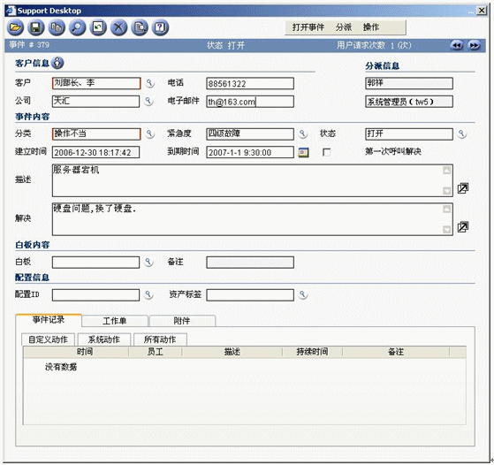 事件記錄應(yīng)該在某個服務(wù)臺工具中記錄和跟蹤,該工具最好是作為集成的服務(wù)管理工具集的構(gòu)成部分。該工具應(yīng)該在引發(fā)新的事件時提供最基本的事件記錄。比如為了幫助提高效率,當(dāng)你在天匯幫助臺的用于記錄事件的事件窗口中輸入請求發(fā)起者的姓名時,利用客戶數(shù)據(jù)庫可以自動填充諸如位置、部門和聯(lián)系詳細信息等字段。天匯幫助臺還支持使用計算機電話集成