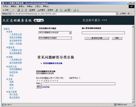 進入自助服務(wù)系統(tǒng)的模式確定了對查詢者可用的功能。如天匯幫助臺應(yīng)提供標(biāo)準(zhǔn) Web 界面和搜索引擎。