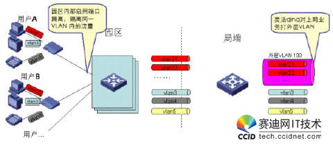 用戶業(yè)務主要為HSI(上網(wǎng)業(yè)務)、IPTV業(yè)務和VOIP業(yè)務,每種業(yè)務對網(wǎng)絡的要求各不相同,為了便于QOS和安全策略的部署,因此我們必須將業(yè)務進行區(qū)分。最簡單的辦法就是通過不同VLAN來標記不同的業(yè)務。