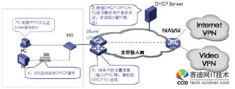 當網(wǎng)絡設(shè)備收到STB的DHCP請求報文時,需要在報文后添加OPTION82字段,此時有兩種模式進行DHCP+認證,一種是直接把DHCP報文送給DHCP服務器,由DHCP服務器根據(jù)OPT82字段來判斷該用戶是否為合法用戶,從而決定是否為其分配IP地址。另一種是DHCP報文先送到BRAS,由BRAS將OPT82字段放到RADIUS的一個子域里,通過RADIUS服務器來進行用戶合法性認證,若用戶合法,再由DHCP服務器分配IP地址。