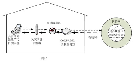 to Point Protocol over Ethernet)方式連接到ONU或ADSL的調(diào)制解調(diào)器上,手機通過有線寬帶接入網(wǎng)與采用TCP/IP協(xié)議的因特網(wǎng)就連接起來了,這樣手機用戶就可去享受免費IP包服務。