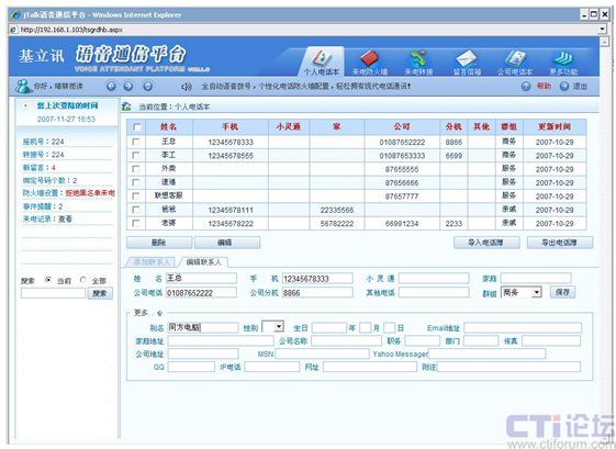 員工管理系統(tǒng)用于每個(gè)員工管理自己的電話本信息、防火墻設(shè)置、留言信箱、電話轉(zhuǎn)接、電話綁定、事件提醒、來電記錄等等電話秘書功能;每個(gè)員工都擁有自己獨(dú)立的帳號(hào)和密碼,可以通過網(wǎng)頁和電話兩種方式管理自己的秘書管理系統(tǒng)。
