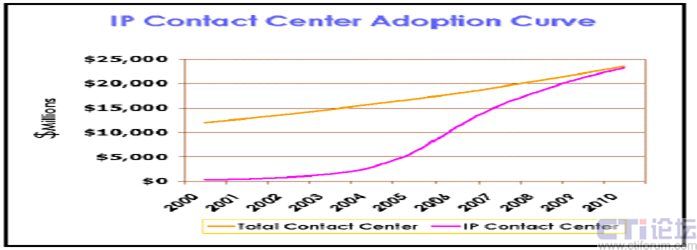 支持多渠道上的聯(lián)系以及降低集中網(wǎng)絡和標準硬件的成本的需求構成了IP技術的主要推動力。正如當前通訊網(wǎng)絡領域內正在進行的從回路到IP的技術轉移一樣,在聯(lián)系中心技術的領域也有相應的轉移。下圖描述了這一轉移,根據(jù)現(xiàn)有數(shù)據(jù)外推并預測了直至2010年世界范圍內投資于聯(lián)系中心IP技術的金額以及所占整個聯(lián)系中心投資的比例。