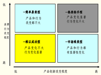 一般來說,產品創(chuàng)新程度越大,取得突破性的成就就越大,但這往往需要消費者改變消費行為和習慣。消費行為的改變是一個漸進的過程。對于企業(yè)來說,開發(fā)一個對客戶有價值的創(chuàng)新產品,要想獲得成功,必須盡量減少消費者行為的改變。我們以消費行為改變程度和產品創(chuàng)新改變程度兩方面進行組合得到一個矩陣: