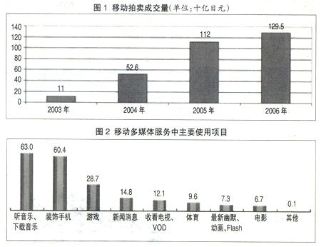 日本的在線購物和拍賣市場起步較晚,但發(fā)展速度較快,用戶的認(rèn)知度也比較高,有41%~48%的移動互聯(lián)網(wǎng)用戶使用過該項業(yè)務(wù)。十幾歲到二十幾歲的女性較傾向于使用該業(yè)務(wù)。2006年移動拍賣的成交量為1295億日元,占到了通過手機(jī)在線購買成交量的1/2(見圖1)。