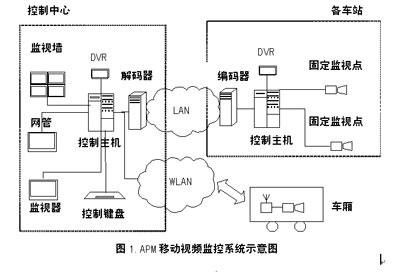 移動(dòng)視頻監(jiān)視系統(tǒng)主要包括前端設(shè)備、后端設(shè)備和傳輸設(shè)備組成。前端設(shè)備主要指圖像攝取設(shè)備(如各種類型的攝像機(jī)),后端設(shè)備主要指圖像顯示、圖像錄制、系統(tǒng)控制等設(shè)備,前后端需要通過(guò)傳輸系統(tǒng)連接。為了支持系統(tǒng)的移動(dòng)功能,傳輸環(huán)節(jié)中至少有一部分是無(wú)線傳輸系統(tǒng)。APM移動(dòng)視頻監(jiān)控系統(tǒng)的組成如圖1所示。