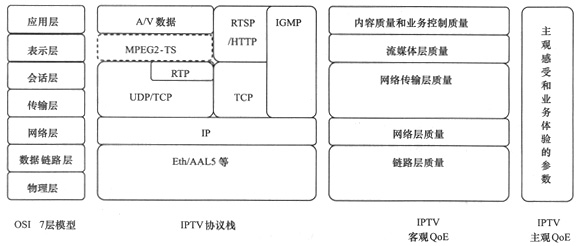 圖2 IPTV業(yè)務質(zhì)量模型與OSI 7層模型和IPTV協(xié)議棧的關系