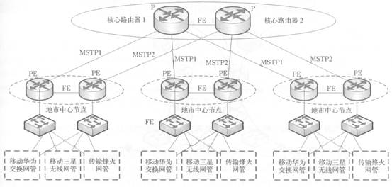 在地市分公司的中心節(jié)點(diǎn)配置兩臺(tái)中端PE路由器和兩臺(tái)以太網(wǎng)交換機(jī),負(fù)責(zé)各個(gè)業(yè)務(wù)網(wǎng)元、終端的規(guī)范接入,通過(guò)在交換機(jī)上劃分不同的VLAN對(duì)各個(gè)業(yè)務(wù)系統(tǒng)進(jìn)行隔離,各業(yè)務(wù)接入到各自的VPN中。PE