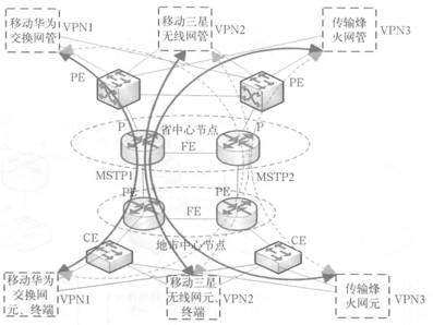 采用MPLS VPN技術(shù)可以把現(xiàn)有的物理實(shí)體IP網(wǎng)絡(luò)分解成邏輯上隔離的網(wǎng)絡(luò),各隔離開(kāi)的網(wǎng)絡(luò)之間感知不到對(duì)方網(wǎng)絡(luò)的存在。在物理上是同一硬件設(shè)備承載,但在邏輯上網(wǎng)絡(luò)是完全隔離的。0SS承載網(wǎng)正是需要這樣的一種承載方式,把各專業(yè)各廠家的多種網(wǎng)管配置到不同的邏輯業(yè)務(wù)區(qū)VPN中,如移動(dòng)華為交換網(wǎng)管配置到VPNl中,移動(dòng)三星無(wú)線網(wǎng)管配置到VPN2中,傳輸烽火網(wǎng)管配置到VPN3中,對(duì)每一套網(wǎng)管系統(tǒng)都使用同樣的物理承載不同的VPN完成從地市分公司的網(wǎng)元或終端到網(wǎng)管服務(wù)器的連接,各VPN之間相互獨(dú)立、相互隔離。