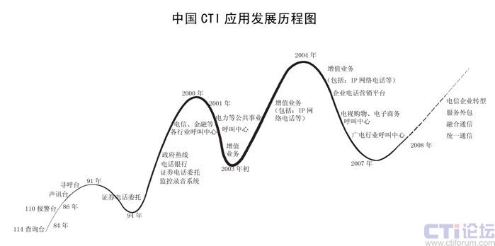 CTI在中國已經(jīng)發(fā)展了二十多年,已經(jīng)從最早的電信行業(yè)CTI應(yīng)用發(fā)展到金融(包括銀行、保險、證劵及基金)、電力、郵政、企業(yè)(包括煙草、汽車、家電、IT、互聯(lián)網(wǎng)、旅游、報業(yè)、航空、物流、醫(yī)療、公共事業(yè)等)、政府、軍隊等各行各業(yè)的應(yīng)用。特別在1995年到2001時期,是CTI應(yīng)用發(fā)展最快,普及面最廣的時期,也是CTI市場進(jìn)入了第二次高潮;從2002開始增值業(yè)務(wù)是整個CTI行業(yè)的突破口,整個行業(yè)以增值業(yè)務(wù)為主,CTI市場進(jìn)入了第三次高潮;從2006年開始,增值業(yè)務(wù)進(jìn)入了衰退期,整個CTI行業(yè)市場出現(xiàn)了嚴(yán)重的危機,加上新的技術(shù)出現(xiàn),技術(shù)的換代,對原來的傳統(tǒng)語音產(chǎn)品和公司是個致命的打擊。