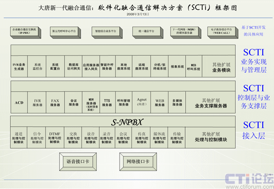 案例:我與大唐中聯(lián)(大唐融合)、和創(chuàng)世紀(jì)、華夏成訊等公司的技術(shù)開發(fā)人員經(jīng)過幾年來(lái)的摸索與實(shí)踐開發(fā),提出軟件化融合通信解決方案(SCTI)。通過計(jì)算機(jī)的軟件(通信服務(wù)系統(tǒng))來(lái)實(shí)現(xiàn)交換機(jī)上的所有通信功能,在互聯(lián)網(wǎng)上實(shí)現(xiàn)所有傳統(tǒng)通信網(wǎng)上的所有功能、還實(shí)現(xiàn)互聯(lián)網(wǎng)上的新的通信功能,在與傳統(tǒng)通信網(wǎng)上相連,只需增加一塊語(yǔ)音接口卡,就能實(shí)現(xiàn)互聯(lián)網(wǎng)與傳統(tǒng)通信的統(tǒng)一。此方案的成本比統(tǒng)一通信、融合通信等解決方案的成本要降幾十倍到上百倍。