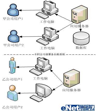 傳統(tǒng)軟件是在公司內(nèi)部架設軟件運行環(huán)境,自己購買應用服務器、數(shù)據(jù)庫服務器、網(wǎng)卡等硬件,安裝自己的局域網(wǎng)并在局域網(wǎng)內(nèi)部署軟件。所以不同公司都各自部署一套自己的系統(tǒng)。不同公司的用戶事實是通過不同的途徑訪問不同的系統(tǒng),如圖2所示:
