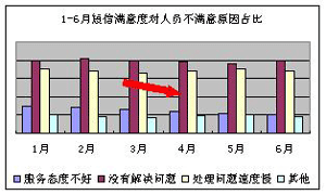 客服代表的工作情緒及客戶滿意度呈現(xiàn)上升趨勢:3-6月的短信滿意度穩(wěn)步提升(見下圖1),6月短信滿意度較3月提升1.25個百分點,短信滿意度調查中“非常滿意”項占比自4月份開上升1.42個百分點(見下圖2)。從客戶不滿意原因情況看,由于人員導致客戶不滿意的比例下降0.6%(見下圖3);對導致人員不滿意的原因分析可知,話務員服務態(tài)度不好的占比有明顯的下降(見下圖4)。