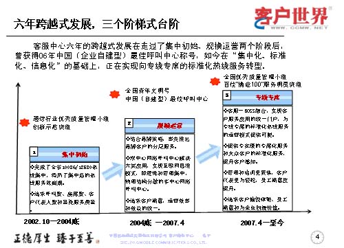 六年的跨越式發(fā)展,走過了集中初始,規(guī)模運營兩個階段。曾經(jīng)獲得也是今天主辦方的06年中國(企業(yè)自建型)最佳呼叫中心稱號。如今在集中化、標(biāo)準(zhǔn)化、信息化的基礎(chǔ)上,正在向?qū)>專席標(biāo)準(zhǔn)化的熱線服務(wù)轉(zhuǎn)型。