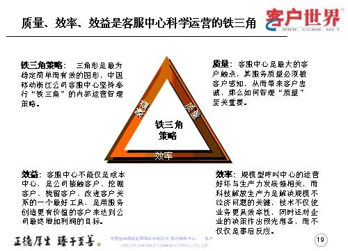 應(yīng)該說這三個方面是科學(xué)運營的一個鐵三角,這是我們的理解,因為三角形,始終認(rèn)為是最穩(wěn)定、簡單、有效的圖形,也是我們在進(jìn)行內(nèi)部運營的管理鐵架。質(zhì)量是客服中心最大的觸點當(dāng)中被客戶感知,從而帶來客戶忠誠的,如何管理質(zhì)量,那就至關(guān)重要。效率尤其是規(guī)模型的呼叫中心的運營好壞,是與生產(chǎn)力的發(fā)展強相關(guān),而科技解放生產(chǎn)力是解決規(guī)模問題的關(guān)鍵。技術(shù)不僅是運行更具效益率,同時還對企業(yè)的決策作出預(yù)先準(zhǔn)備,而不僅僅是事后反應(yīng)。很多年來,更多的企業(yè)是把客服中心視為成本中心,而事實上,效益的顯現(xiàn)讓我們陸續(xù)地走出了成本中心,它應(yīng)該是公司接觸客戶、挖掘客戶、挽留客戶、改進(jìn)客戶關(guān)系的一個最好工具,是用服務(wù)創(chuàng)造更有價值的客戶,來達(dá)到公司最終增加利潤的目標(biāo)。