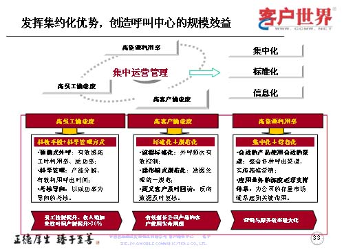 作為集中管理來講,突出“三高”,運用好“三高”體現(xiàn)的是如何進(jìn)行集中化、標(biāo)準(zhǔn)化和信息化。我們從高員工滿意度,高客戶滿意度和高資源利用率入手,高員工滿意度主要是應(yīng)用平臺和科學(xué)的管理方法,使得員工的技能持續(xù)提升,員工的自身收入也按單位時間而增長;高客戶滿意度是用標(biāo)準(zhǔn)化和規(guī)范化來進(jìn)一步優(yōu)化流程,改進(jìn)操作,對于目標(biāo)客戶及時回訪,有效地延長公司產(chǎn)品的客戶使用生命周期,以創(chuàng)造公司的最大利益;作為集中化的呼叫中心,系統(tǒng)已經(jīng)投入了較大的座席規(guī)模,高資源利用率是如何把這些座席和系統(tǒng)的規(guī)模應(yīng)用得更好,使得我們的產(chǎn)品能夠進(jìn)一步地推向市場,被客戶所接受,所以我們采取了更多的整合呼出渠道,精確營銷,尤其對公司的存量客戶進(jìn)行持續(xù)維系的關(guān)鍵時刻,達(dá)到營銷與服務(wù)效率的最大化。