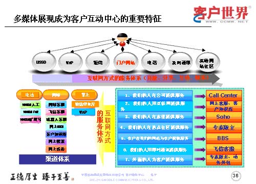 世界上卓越的企業(yè)無所不在,在客戶戰(zhàn)略上最具創(chuàng)新能力的企業(yè),奠定起的競爭,也會越來越出體現(xiàn)在客戶關(guān)系管理上,隨著數(shù)據(jù)業(yè)務(wù)成為運營商的主流業(yè)務(wù),呼叫中心在服務(wù)、營銷、渠道管理等方面的戰(zhàn)略地位會日益重要,隨著客戶接觸的不斷增長,呼叫中心將逐漸演變成客戶接觸中心、互動中心,乃至包括實體渠道之外的各種電子渠道,任重而道遠(yuǎn)。