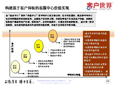 最后我想世界級的呼叫中心戰(zhàn)略是我們從事客戶服務(wù)行業(yè),從事呼叫中心人的方向,從我們理解的世界級呼叫中心特征來講,管理團隊?wèi)?yīng)對呼叫中心的運營原理有系統(tǒng)的理解,并貼切地應(yīng)用到業(yè)務(wù)實踐,創(chuàng)造積極向上的工作氛圍,鼓勵員工成長,能夠闡述呼叫中心的戰(zhàn)略價值,制訂并達(dá)到本部門的目標(biāo),為企業(yè)利潤的增長作出杰出的貢獻(xiàn),杰出的員工滿意度和客戶滿意度。所以世界級呼叫中心我們理解是從七個方面來衡量,以“客戶為中心”,多種客戶溝通的聯(lián)絡(luò)渠道,低員工流失率和高客戶滿意度,高效率、低成本,高“一次性解決率”,對客戶服務(wù)請求的快速反應(yīng)與處理,技術(shù)驅(qū)動與創(chuàng)新。