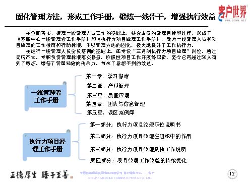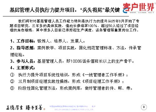 大家知道基層管理人員其實是兵頭將尾的最關(guān)鍵,我們將對基層管理人員的工作能力,特別是執(zhí)行力的提升是從05年8月份就開始了專項研究,三年多的具體實踐,值班長的培訓(xùn)率達(dá)到100%,超過50人經(jīng)過了項目經(jīng)理的角色鍛煉,目前很多擔(dān)任過項目經(jīng)理的已經(jīng)承擔(dān)了生產(chǎn)調(diào)度、話務(wù)管理等重要的管理崗位。在這個項目當(dāng)中,我們從四個方面入手,工作目標(biāo)是鍛煉人、培養(yǎng)人、發(fā)展人。指導(dǎo)思想是案例教育、項目實踐,固化規(guī)范管理標(biāo)準(zhǔn)、方法,傳承管理經(jīng)驗。參與人員就是基層管理人員,話務(wù)值班長以上的生產(chǎn)骨干。我們主要運用的形式是執(zhí)行力提升項目系統(tǒng)培訓(xùn),形成了《一線管理者工作手冊》。三月制項目經(jīng)理的實踐操練,通過競聘的方式產(chǎn)生,形成了《項目經(jīng)理工作手冊》。階段性的固化-優(yōu)化-再固化的管理方法,形成案例庫,做好管理者的傳幫帶。