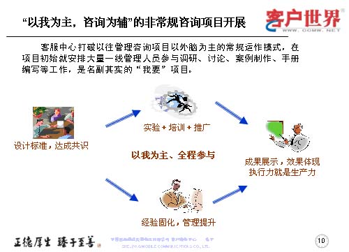 這個管理咨詢項目開展中,是以我為主,咨詢?yōu)檩o的非常規(guī)咨詢項目,打破的是以外腦為主的常規(guī)運作模式,在項目初期就有大量的一線管理人員參與調(diào)研、討論、案例制作、手冊編制,是名副其實的“我要”項目。那么在這個方面我們分成了三部曲,設(shè)計標(biāo)準(zhǔn)、達(dá)成共識,通過實驗加培訓(xùn)推廣,以我為主的全程參與,來固化經(jīng)驗,提升管理。最后成果展示,效果體現(xiàn)于執(zhí)行力,彰顯出生產(chǎn)力。