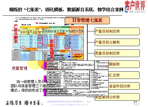 我們精煉了這么七張表的方式,運用三個維度:產(chǎn)量管理、質(zhì)量管理和團隊與信息管理,而這些基礎(chǔ)數(shù)據(jù)都來自于系統(tǒng),教學(xué)和案例。而七張表是從產(chǎn)量、質(zhì)量和團隊信息來展現(xiàn)出具體的一些應(yīng)用,將一線管理人員從日常工作的三個維度入手,形成七張表管理模式,很好地具備了操作標(biāo)準(zhǔn)和規(guī)范。這模板表除了系統(tǒng)出來的一些數(shù)據(jù)以外,通過我們基層管理人員的項目執(zhí)行和跟蹤檢查,形成一些案例,改進(jìn)計劃和改進(jìn)意見。這幾張表多為系統(tǒng)自身所產(chǎn)生一些具體的數(shù)據(jù),比如說上個月的指標(biāo)值如何設(shè)定,實際達(dá)成的產(chǎn)量怎樣,回訪滿意率具體有哪些數(shù)據(jù),都在客服系統(tǒng)的報表中提煉出來的相關(guān)數(shù)據(jù)。