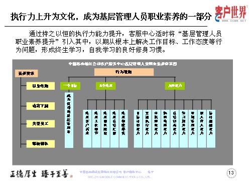 在執(zhí)行力上升文化的同時,基層管理者的職業(yè)素養(yǎng)是我們時刻去追求的,所以客服中心適時地將基層管理人員的職業(yè)素養(yǎng)引入到其中,以期從根本上解決工作目標(biāo)、工作態(tài)度等問題,形成終生學(xué)習(xí),自我學(xué)習(xí)的良好修身習(xí)慣。這是我們客服中心基層管理人員職業(yè)素養(yǎng)的一個體系圖,首先從素養(yǎng)要求的四個維度,行為準(zhǔn)則的一、五、九來展現(xiàn)。一個目標(biāo)是成為優(yōu)秀的管理者,五個注重是注重客戶需求、注重工作細(xì)節(jié)、注重團隊建設(shè)、注重總結(jié)匯報、注重制度落實。九種能力:目標(biāo)計劃能力,貫徹執(zhí)行能力、分析解決能力、協(xié)調(diào)溝通能力、總結(jié)創(chuàng)新能力、時間管理能力、師人育人能力和標(biāo)桿超越能力。這個一、五、九,讓它彰顯出素養(yǎng)和表現(xiàn)的四個維度,以身作則、培育下屬、關(guān)愛員工和鍛造團隊。