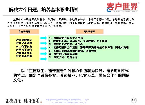 一線客服人員如何來全面提升職業(yè)能力,首先是解決一線客服人員的六個問題,剛才已經(jīng)跟大家交流了客服中心一線人員的人員結(jié)構(gòu),當(dāng)前的六個主要問題可以用簡單的幾個方面來表述:對生活沒有明確的目標(biāo)、對自己不進(jìn)取、對工作不負(fù)責(zé)、對同事不合作、對顧客不關(guān)心、對企業(yè)不忠誠,這是在日常工作中,一線人員所存在的問題。而針對這些問題,我們要用工作目標(biāo)去持續(xù)解決和克服問題,所以我們采取的是讓大家明確企業(yè)目標(biāo)與個人使命,用積極的心態(tài)自主自發(fā),主動積極和個人領(lǐng)導(dǎo);良好的工作態(tài)度責(zé)任心,良好的團隊合作氛圍;熟練掌握溝通技巧和方法,牢固樹立顧客滿意的意識,以客為尊;良好的行為素質(zhì)習(xí)慣,自我學(xué)習(xí),終身學(xué)習(xí)。從而在中國移動集團“正德厚生、臻于至善”的核心價值觀指導(dǎo)下,結(jié)合呼叫中心特點,確定誠實務(wù)信,愛崗敬業(yè),以客為尊、團隊合作的團隊文化。