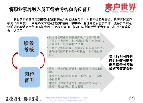 職業(yè)素養(yǎng)不是說在嘴上,講在課上,而是更多地融入到員工的績效考核于崗位晉升當(dāng)中。以解決工作素養(yǎng)要求和實際工作的兩張皮,以及使得客服理念成為理論的空中樓閣。所以我們是持之以恒地開展一線員工組織認(rèn)同滿意度調(diào)查,我們每年都會做一線客服人員的滿意度調(diào)查,在滿意度調(diào)查當(dāng)中,從05年的69.3%,提升到07年的73.9%,而且遙遙領(lǐng)先于營業(yè)員和客服經(jīng)理。而在績效考核中主要把員工行為素質(zhì)、團隊合作占到了員工月度績效的16.5%,使大家認(rèn)識到作為一個組織中的一員,作為團隊我們是為了一個共同的目標(biāo),彼此依賴、彼此信任,同時也要強化績效來管理。所以主要的評分依據(jù)是客觀、可衡量、有依據(jù)可查,同時也把這些也作為客服人員季度晉升和月度績效考評掛鉤,如果該員工季度的平均考核在良好以下的話,將得不到晉升,最終實現(xiàn)的是員工行為可評價,評價標(biāo)準(zhǔn)可衡量,衡量結(jié)果可考核,最終考核定晉升。