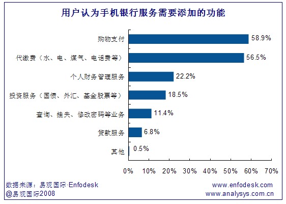《2008年中國(guó)個(gè)人網(wǎng)上銀行市場(chǎng)用戶調(diào)研報(bào)告-手機(jī)銀行》研究發(fā)現(xiàn),用戶認(rèn)為手機(jī)銀行需要添加的功能主要為購(gòu)物支付和代繳費(fèi),分別占58.9%和56.5%。