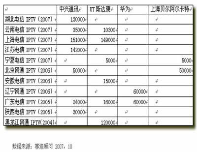 在IPTV設(shè)備供應(yīng)商中,各家廠商各有千秋,其中在國內(nèi)市場占有率最好的是中興通訊,其次是UT斯達康、華為、上海貝爾阿爾卡特。中興通訊跟華為均能提供端到端的解決方案,從頭端到客戶端,從業(yè)務(wù)層到傳輸層,提供完整的設(shè)備,可以使用統(tǒng)一的平臺對整個系統(tǒng)進行管理,并且在保證統(tǒng)一的同還提供了較好的開放性,支持多家內(nèi)容提供商及STB的接入。