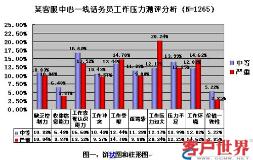 標準的心理測驗都有固定的評分體系,其結果解釋通常也是固定模式的,譬如在16PF人格測試中有一個因素是“聰慧性”,其低分解釋是:學識淺薄,抽象思考能力弱,通常學習能力不強,不能“舉一反三”;高分解釋是:聰明、富有才識,善于抽象思考,通常學習能力強,思考敏捷。而針對呼叫中心人員的結果解釋就不能如此泛泛而談,應結合座席代表的工作特性來做相應的解釋,使結果呈現(xiàn)得更直觀。另一種呈現(xiàn)測量結果的方式是采用下面餅狀圖或柱形圖的方式,采用此種方法的好處是用圖形便于更好地做差異性比較。