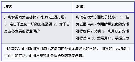 廣電、電信作為運(yùn)營商,在成長中都在殊途同歸的向著以IPTV為代表的互動(dòng)方向轉(zhuǎn)變。雙方競爭的焦點(diǎn)將從原本的純政策因素逐步轉(zhuǎn)變?yōu)槔娣指睢?