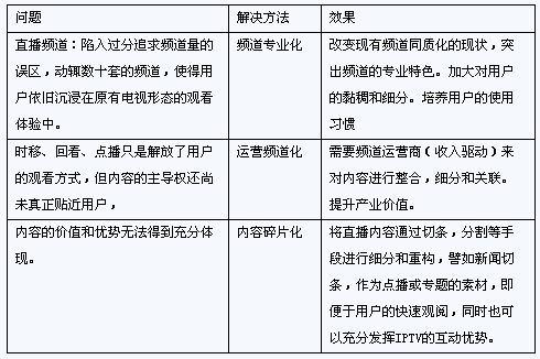 IPTV發(fā)展中,傳統(tǒng)視頻業(yè)務(wù)既是切入點(diǎn),同時(shí)也是業(yè)務(wù)收入的重要來源。但目前視頻業(yè)務(wù)的價(jià)值還未得到充分體現(xiàn);(dòng)性優(yōu)勢還未得到充分挖掘。